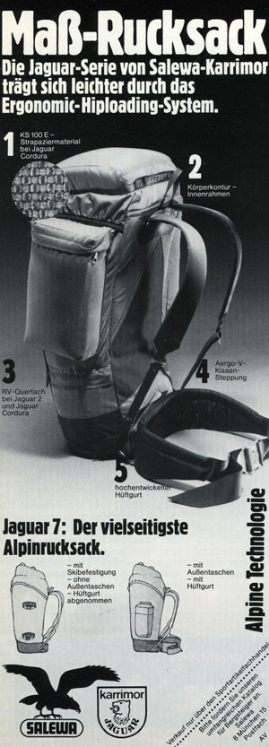 Ожесточившаяся конкурентная борьба отделила зерна от плевел. IBA усиливает английские рюкзаки от BERGHAUS c «анатомическим» предписанием для ношения для альпинистов и скалолазов, в то время как SALEWA намерена улучшить свои модели Mont Blanc, Ortler и Bergell – годами успешные в использовании, и не поднимать цену с 1974 года. Новой моделью в поколении рюкзаков SALEWA стала серия Karrimor – модель средних размеров для альпинистских походов – обещает большой успех не только из-за выгодной цены ок. 79 DM.
