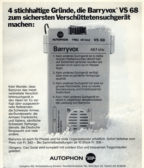 Barryvox используется как частными лицами, так и организациями. В настоящий момент поставка осуществляется по цене 340 фр. При оптовом заказе в 10 шт. – по 306 фр.