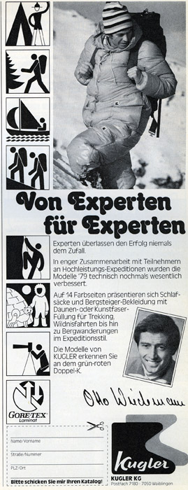 Мы тестировали суперпуховки на основе гортекса, изготовленные компанией Karl Kugler KG, 7050 Вайблинген-Хоэнакер, в течение трех месяцев в Каракоруме и Непале. Пуховик имеет в общей сложности 6 карманов: 4 внешних, два внутренних; непрерывную молнию, плюс к этому еще и кнопочную застежку, которая, с одной стороны, обеспечивает еще большую плотность, а, с другой, в случае повреждения молнии продолжает удерживать тепло в достаточном объеме; пристегиваемый к воротнику капюшон (на молнии) имеет небольшой слой пуха, и в нем достаточно тепло. Мы использовали пуховики ежедневно, не щадя их ни в дождь, ни в мороз, часто в тяжелых условиях.
