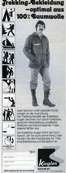 Коллекция Куглер представлена в специализированной торговле, где Вас охотно проконсультируют, или требуйте цветной каталог туристической одежды и одежды для альпинизма.