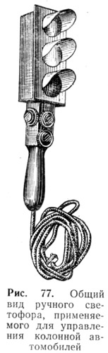 В ночное время управление осуществляется передачей световых сигналов фонарями или светофорами (рис. 77), по радио и в необходимых случаях сигнальными ракетами.