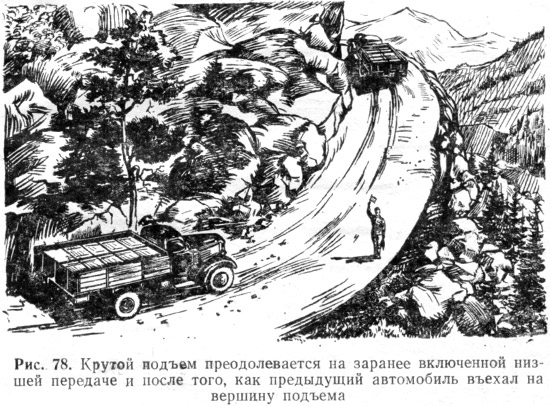 Известную трудность для автомобильной колонны представляет преодоление крутых подъемов и спусков. Бывали случаи, когда неопытный водитель перед подъемом включал повышенную передачу. Вследствие недостаточной мощности двигателя обороты вала двигателя снижались, скорость движения падала и водитель, опасаясь остановки, выключал сцепление и переходил на низшую передачу. Автомобиль останавливался и в следующий же момент под действием силы веса начинал скатываться назад. Возникала аварийная обстановка.
