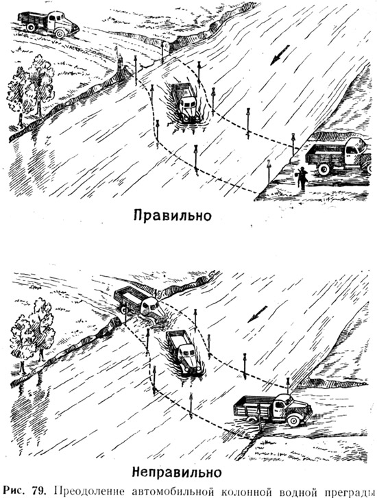 Водные преграды автомобильная колонна преодолевает после разведки брода, подготовки путей съезда и выезда и организации службы регулирования. Путь движения машин обозначается вешками (рис. 79).