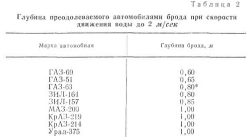 Наибольшая глубина брода для основных марок автомобилей указана в табл. 2.