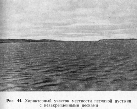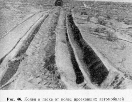 Пустынно-песчаная местность характеризуется тяжелыми дорожными условиями. Дорожная сеть в пустыне развита слабо, а движение вне дорог крайне затруднено. Дороги песчаной местности имеют солончаковые, лёссовые участки и участки с незакрепленными песками (рис. 46).