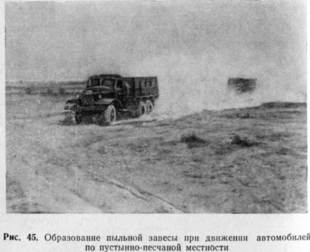 Одной из особенностей движения автомобилей в летнее время по грунтовым дорогам в пустынно-песчаной местности является большая запыленность воздуха при любом ветре. При движении автомобилей высокая температура и низкая влажность воздуха способствуют созданию густых облаков пыли (рис. 45). Сильная запыленность воздуха происходит из-за сдвига ведущими колесами слабо связанного грунта и завихрения воздуха, усиливающегося при повышении скорости движения автомобиля.