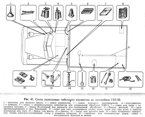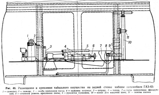 Саперная лопата, например, на автомобиле ГАЗ-63 крепится снизу пола платформы кузова между первым и вторым поперечными брусьями с помощью зажима и пластинчатой скобы. Топор укладывается за спинкой сиденья. Буксирный трос на автомобилях размещается в инструментальном ящике. Длина буксирного троса 4 м, а жесткого буксира – 2,5 м. Размещение табельного имущества на автомобиле ГАЗ-63 показано на рис. 47, 48 и 49.