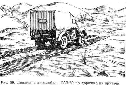 Участки пути с незакрепленными песками автомобили преодолевают на пониженной передаче. Направление выбирают так, чтобы при движении избежать крутых поворотов и переключения передач. Преодолевая песчаные участки пути малой протяженности, водитель использует инерцию автомобиля. Резкие повороты при движении по песку не допускаются, так как при этом создаются песчаные валы перед передними колесами, а это обычно приводит к застреванию автомобиля. При погружении колес автомобиля в песок следует срыть песок перед передними и задними колесами и продолжать движение. Если это не помогает, то применяют средства повышения проходимости автомобилей в песках.