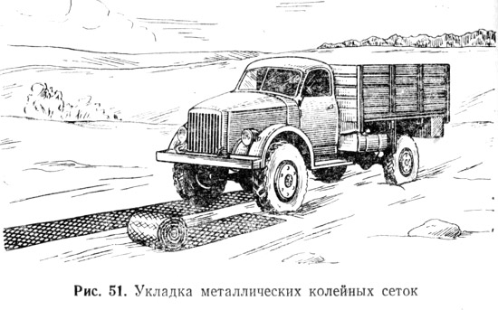 Дорожки из прутьев и металлической сетки применяются для преодоления автомобилями сыпучих (незакрепленных) песков (рис. 50 и 51).
