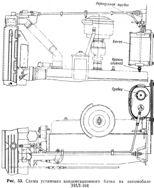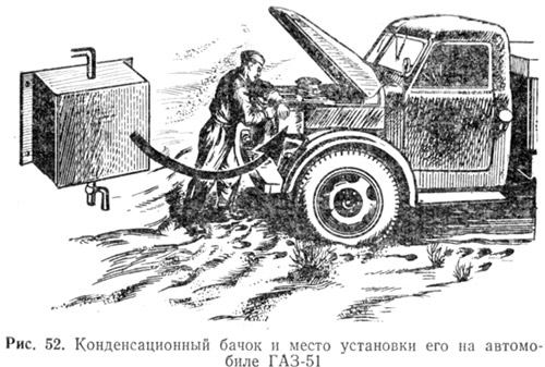При работе вдали от источников воды автомобили обеспечивают возимым запасом воды в размере 1 – 2 заправок. Для снижения расхода воды на автомобиль устанавливают конденсационный бачок (рис. 52).
