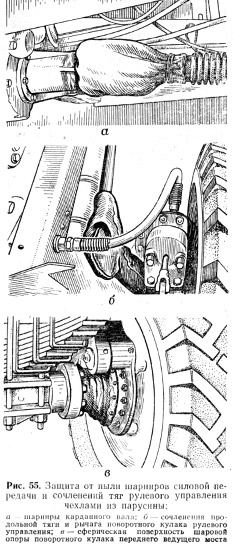 Шарниры карданных валов (рис. 55), сочленения тяг рулевого управления и сферическую поверхность шаровой опоры поворотного кулака переднего ведущего моста защищают от пыли пыленепроницаемыми чехлами из брезента и парусины. Основные мероприятия по обслуживанию агрегатов и деталей силовой передачи сводятся к очистке их от пыли, к проверке наличия и качества смазки, а также к регулярной смазке узлов и сочленений.