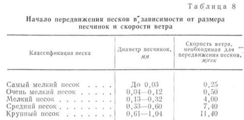 Начало передвижения песков зависит от размеров песчинок и скорости ветра у поверхности земли (табл. 8).
