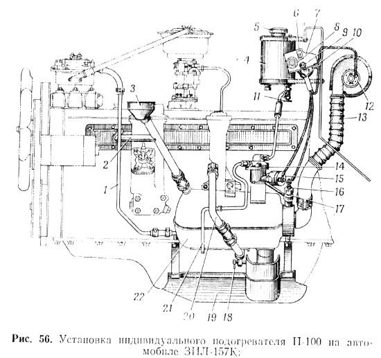 Часть выпускаемых отечественных автомобилей оборудована индивидуальными подогревателями. Например, на двигателях автомобилей ГАЗ-51 и ГАЗ-63 установлен пусковой котел подогрева. На автомобиле ЗИЛ-157К устанавливается специальный пусковой подогреватель П-100 (рис. 56).