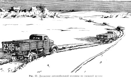 Движению по снежной целине обязательно предшествует разведка. Для этого водитель сам проверяет глубину снега по будущей трассе движения, нет ли ям, камней, пней и других предметов, которые могут затруднить движение и повредить ходовую часть. Короткие участки глубокого снега преодолевают с ходу по инерции. Длинные участки бездорожья проезжают на пониженной передаче, с постоянными оборотами вала двигателя и используют колею прошедших автомобилей (рис. 57). При управлении автомобилем не рекомендуется круто поворачивать руль, чтобы не увеличить и без того значительное сопротивление качению колес. В случае застревания автомобиля в снегу буксование не допускается. Для вывода застрявшего автомобиля расчищают снег перед передними и задними колесами, откатывают автомобиль назад, подсыпают под ведущие колеса песок или подкладывают сучья или другой подручный материал. После этого преодолевают препятствие с разгона и продолжают движение.