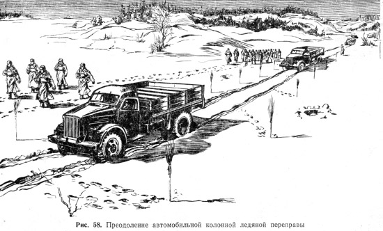 Преодолевая ледяную переправу, надо знать необходимую для безопасного движения толщину льда и его состояние. Перед началом движения открывают обе двери кабины и высаживают людей из кузова. По сигналу регулировщика съезжают на лед осторожно, без толчков и рывков, затем увеличивают скорость и двигаются равномерно (рис. 58). Потрескивания льда и появления воды из его трещин бояться не следует.