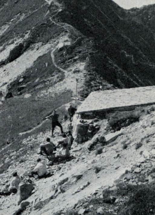 Привал у перевала Санкт-Антёниен, или Гаргеллен. Рядом с альпинистами виден разрушенный домик таможенной службы, нуждающийся в ремонте, чтобы служить пристанищем. Фотографии: Э. А. Зауттер