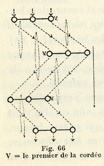 Более слабым лыжникам нужно дать достаточно времени на совершение данного манёвра. Двигаясь таким образом нужно избегать наезда на веревку, привязанную к партнёру, идущему за вами, приподнимая её рукой при поворотах (рис. 67)