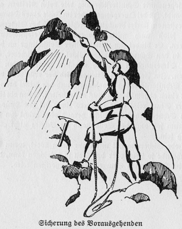Если существует опасность обвалов где-либо на снежных или покрытых льдом склонах, то необходимо подстраховываться канатом. Только в этом случае можно с полной надежностью передвигаться по одному. Это значит: сначала идет первый, останавливается на твердой поверхности и дает сигнал, чтобы начинал движение второй, в то время как он медленно подтягивает канат. Только на не очень крутом склоне, на не слишком жестком снегу можно идти одновременно на небольшом расстоянии друг от друга. Также и при передвижении по снегу, как и при лазании, используется страховка через плечо. При поперечном спуске или при падении впереди идущего нужно опасаться сильных толчков, от которых нужно защищаться при помощи самостраховки. Один привязывает себя при помощи петли каната к глубоко вбитому в снег ледорубу. Это гораздо надежнее, чем просто пропускать страховочный канат вокруг ледоруба. В случае падения первый толчок будет выдержан при помощи страховки через плечо, и на ледоруб придется уже ослабленное давление. Если падение будет слишком долгим, то ледоруб будет вырван из снега, даже если он зарыт в нем по рукоять. Поэтому длина каната не должна быть очень большой.