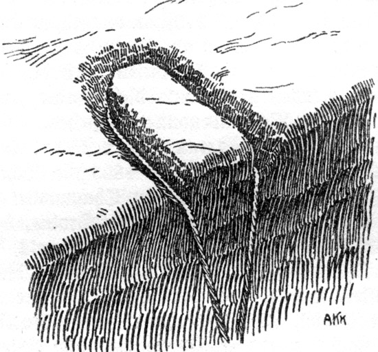 Поскольку очень редко можно сразу же вытянуть человека из-за застревания каната на краю трещины, нужно сделать на краю нишу, чтобы по возможности встать непосредственно над висящим на канате; кроме того, нужно положить на ледяной край ледоруб (рис. 53) и пропустить канат над ней, чтобы он не протирался о жесткий край.