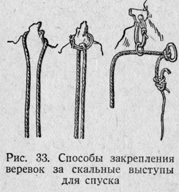 Веревку для спуска укреплять за скальный выступ или крюк, для чего сделать петлю из вспомогательной веревки (2—3 ряда репшнура) и накинуть ее на выступ или присоединить к ушку крюка. Через эту петлю пропустить веревку, на которой будет производиться спуск (рис. 33).
