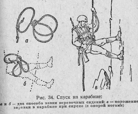 104. Спуск на карабине (рис. 34): после крепления веревки для спуска сделать из вспомогательной веревки сиденье, как показано на рис. 34 а и б, присоединить к нему карабин и одеть сиденье на себя (рис. 34, б); сделать из основной веревки два витка и зацепить их на глухой стороне карабина; взяться за веревку одной рукой ниже карабина, а другой — выше него за узел Прусика, соединенный вспомогательной веревкой с петлей, обвязанной вокруг груди бойца; спуск производить, сидя на веревочном сиденье и скользя карабином по веревке. Ноги при этом могут свободно опускаться или упираться ступнями в скалу (рис. 34, в).