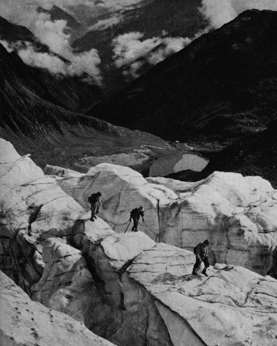 Как уже много раз в промышленных отчетах о снаряжении сообщалось, началась новая эпоха для скалолазов: усовершенствованный ледоруб, топоры для колки льда, весь ассортимент товаров, обеспечивающий надежность на льду, и, наконец, все новые крепления для подъема, с помощью которых можно легко освободиться, взявшись за скобы. Идущий по льду по северной стене Лискама( западная вершина (валлийские Альпы) еще не знал всего этого снаряжения. Фото: Тони Хибелер.