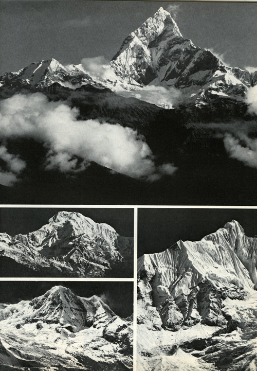 Пешеходный маршрут пролегает через деревни (внизу справа деревня Гхандрунг), мимо водопадов (внизу в ущелье Моди Кхола). Вдали сверкает Мадтхапудихаре. Фото внизу – Южная Аннапурна (7195), Моди Пик (около 7100), наблюдаемые с высоты «Базового лагеря» Аннапурны, а справа – еще никем не покоренный шеститысячник («Габельхорн»).