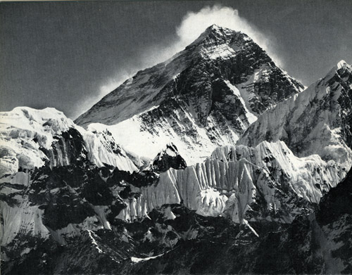 Гора Эверест (от Гокио Ри, 5400 м). Эверест, высотой 8848 м, со своим легко узнаваемым снежным покрывалом. На снимке изображена юго-западная стена горы, так часто выступающая в роли «жертвы» альпинистов. Впервые взобраться на нее в 1973 году удалось японцам после того, как утихли муссоны. Справа – Нуптсе.