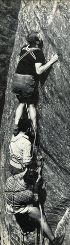 Все больше и больше мы встречаем в горах представительниц «слабого пола»: во время стоянки биваком (слева вверху), в начале восхождения (вверху в центре), во время стоянки палаткой (внизу справа), на самых крутых каменных стенах, где дамы появляются неизменно «часто», и, разумеется, во время высокогорных походов, где на станциях порой вновь подтверждают свою «слабость» (внизу). Женщина в горах давно считается обычным явлением; женоненавистники, к которым относился даже Пауль Пройс, могли частично вымереть, потому что пока как ходят слухи, что «комбинированный» поход в горы также может иметь свою прелесть.