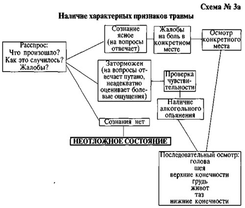 В настоящей работе приведена тактическая схема действий санинструктора при условии, что поставленный ПД верен. Поэтому при определении нового ПД следует вернуться в исходную точку схемы, чтобы, во-первых, исключить возможные осложнения, связанные с неправильно выбранной тактикой действий, а во-вторых, учесть возможные изменения в тактике, позволяющие упростить или усложнить ситуацию. Так, например, если в результате травмы был поставлен ПД: «Ушиб бедра», а по прошествии некоторого времени проявляются признаки перелома, то следует провести соответствующие операции по иммобилизации бедренной кости, противошоковой терапии и ускорить госпитализацию пострадавшего, т.е. действовать с начала тактической схемы, относящейся к перелому бедра.