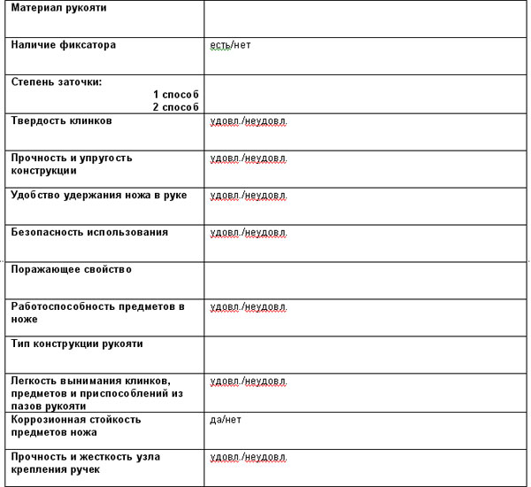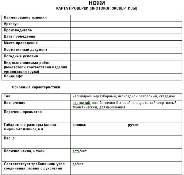 Карта проверки (протокол экспертизы) экспедиционных ножей