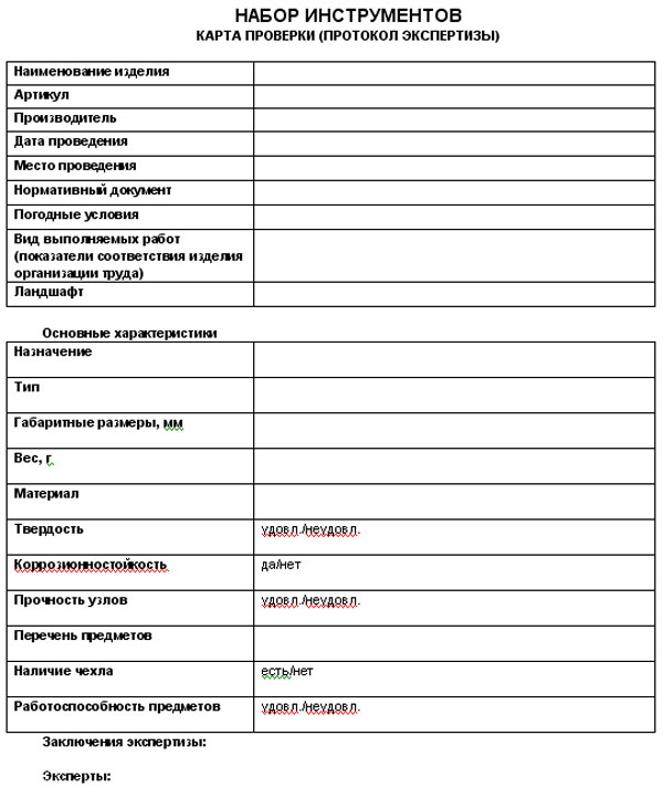 Карта проверки (протокол экспертизы) наборов инструментов