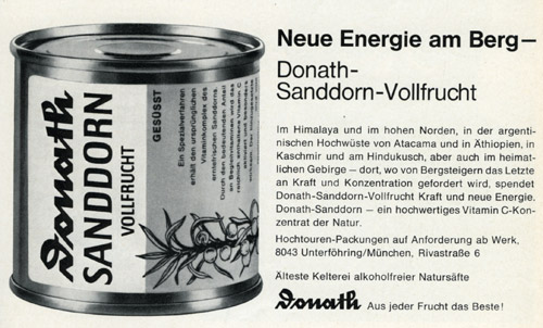 В Гималаях и на Крайнем Севере, в высокогорной пустыне Атакама и в Эфиопии, в Кашмире и на Гиндукуш, а также в отечественных горах – там, где восхождение отнимает много сил и энергии, облепиховый витаминный концентрат придает альпинистам новую энергию и силы. Донат - облепиха – ценный природный источник витамина С.