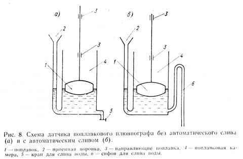 Наиболее простыми системами плювиографов для измерения распределения осадков во времени являются поплавковые (рис. 8). Они состоят из камеры 4 с поплавком, в которую через воронку 2 поступает вода. Высота подъема поплавка, перемещающегося по направляющим 3, однозначно соответствует количеству воды, попавшей в камеру. По такому принципу устроены плювиограф П-2, применяющийся в Советском Союзе; плювиографы Ришара, Гельмана, Фусса, плювиограф фирмы Стевенса в США и плювиографы других конструкций, не получившие широкого распространения.