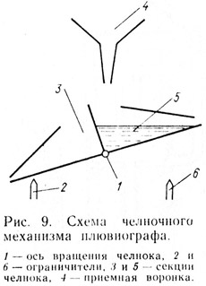 В последнее время широкое применение нашли челночные плювиографы. Принцип действия челночного плювиографа приведен на рис. 9. Собранная приемником осадков вода через воронку 4 попадает в челнок, имеющий секции 3 и 5. Челнок свободно вращается на оси 4 и может принимать два устойчивых положения, опираясь на ограничители 2 и 6. На рисунке приведено то положение челнока, когда секция 5 находится под воронкой 4. При попадании в секцию 5 некоторого определенного количества осадков челнок перекидывается и опирается на ограничитель 6, а находящаяся в нем вода сливается. При заполнении водой секции 3 челнок снова перекидывается. Так как перекидывание челнока происходит при определенном количестве воды, то число отдельных перекидываний может служить мерой количества выпавших осадков.