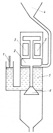 1 -регистратор уровня, 2- поршень, 3 - электромагниты, 4 - приемная воронка, 5 - камеры для воды, 6 - клапан.