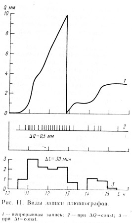 В приборах, предназначенных для дистанционных массовых измерений, наиболее удобен вид записи 3, который позволяет легко кодировать и передавать по проводам или радио данные о количестве осадков за равные, заранее определенные и синхронные интервалы времени. Такой принцип записи реализован в системах.