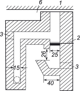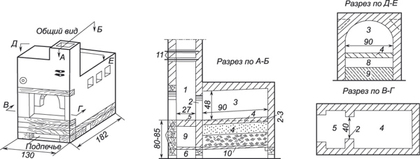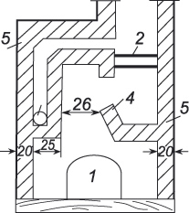 На рисунке 4 дан разрез шестка и чела. На разрезе видны чело, вьюшки или задвижки, отверстие для самоварника шириной 10 сантиметров и отбойный козырек, напоминающий букву Г (4). Для удаления сажи устраиваются прочистки (5) размером 13х13 сантиметров.
