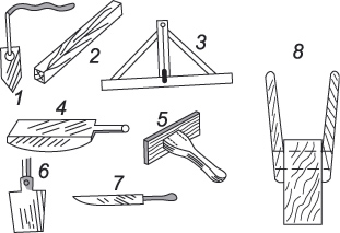 Для работы необходим следующий инструмент. Весок (гирька, привязанная к шнуру), линейка или правило, длиной 190 сантиметров, ватерпас, лопата с прямым концом, нож, валек для уплотнения глины, скребок и трамбовка (рис. 6).