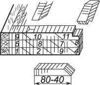 Кладка брусков ведется с перекрытием швов (8). Бруски кладут рядами по всему периметру печи (последовательность показана цифрами), плотно, прижимая друг к другу и дополнительно уплотняя вальком, которым наносят сильные удары по верху и по боковым сторонам. После выравнивания кладки скребком срезают лишнюю глину и стенки проверяют на горизонтальность линейкой, а на вертикальность веском.