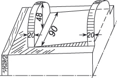 Затем устраивают полуциркульные стенки для горнила. Бруски глины укладывают на ранее устроенные стены, тщательно их уплотняют и выравнивают, обрезая скребком и проверяя вертикальность веском. К стенкам приставляют выполненные на бумаге или картоне шаблоны свода для задней и передней частей, очерчивают их гвоздем или другим острым предметом и обрезают излишки глины ножом, получая две полуокружности: одну впереди высотой от уровня пода 48 сантиметров, другую сзади в 51 сантиметр (рис. 10).