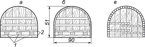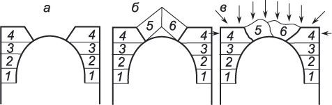 а — порядок устройстве свода, б — устройство замковых брусков в своде, в — положение кусков глины после уплотнения.