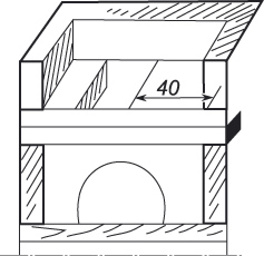 Таким образом, стенка напоминает собой букву Г. Нижний конец ее (отбойный козырек) делается высотой с внутренней стороны в 6—10 сантиметров, но может быть и больше. Козырек должен находиться от ближайшей к нему стенки чела и от верха нижнего козырька не ближе 26 сантиметров.